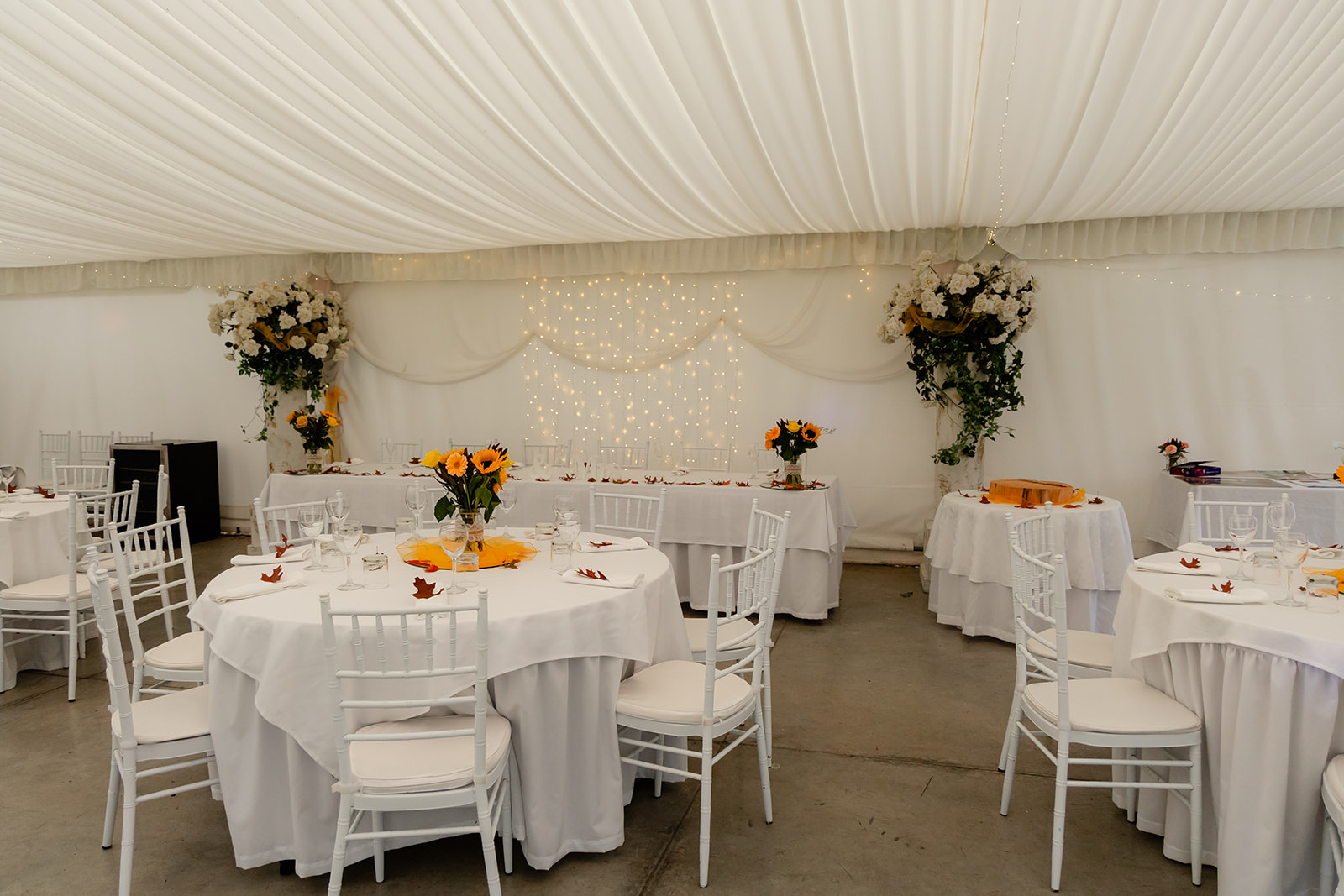 Included with the marquee is the bridal top table, 5 ft round tables seating 8-10 guests and padded chairs, a cake table, present table, bar table, wedding gazebo and garden pillars with roses.